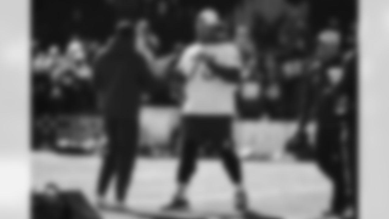 Maddy Glab and Dion Dawkins (73) during the AFC Pro Bowl practice on Feb 3, 2022 at the Las Vegas Ball Park in Las Vegas, Nevada. Photo by Ben Green