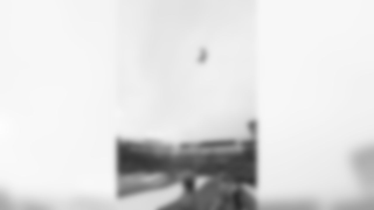 Photos of the game ball delivery, full-field flag, and salute to service ceremony.