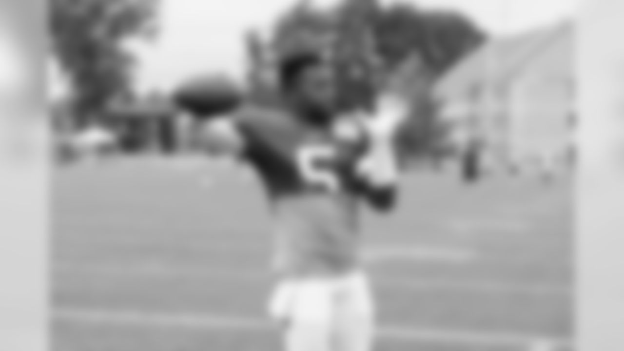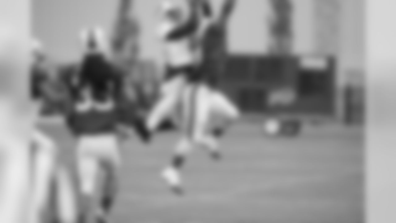 Tight end Nick O'Leary (84) catches a ball during practice.