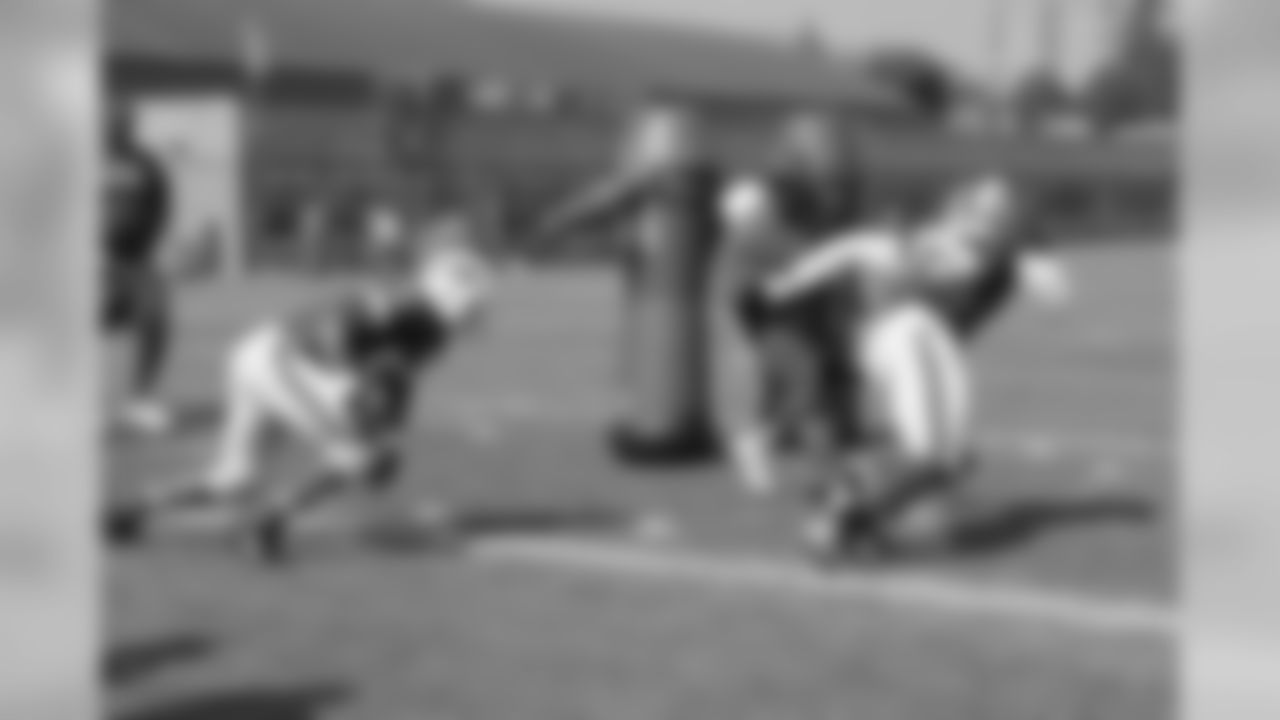 Offensive tackles do hitting drills during practice.