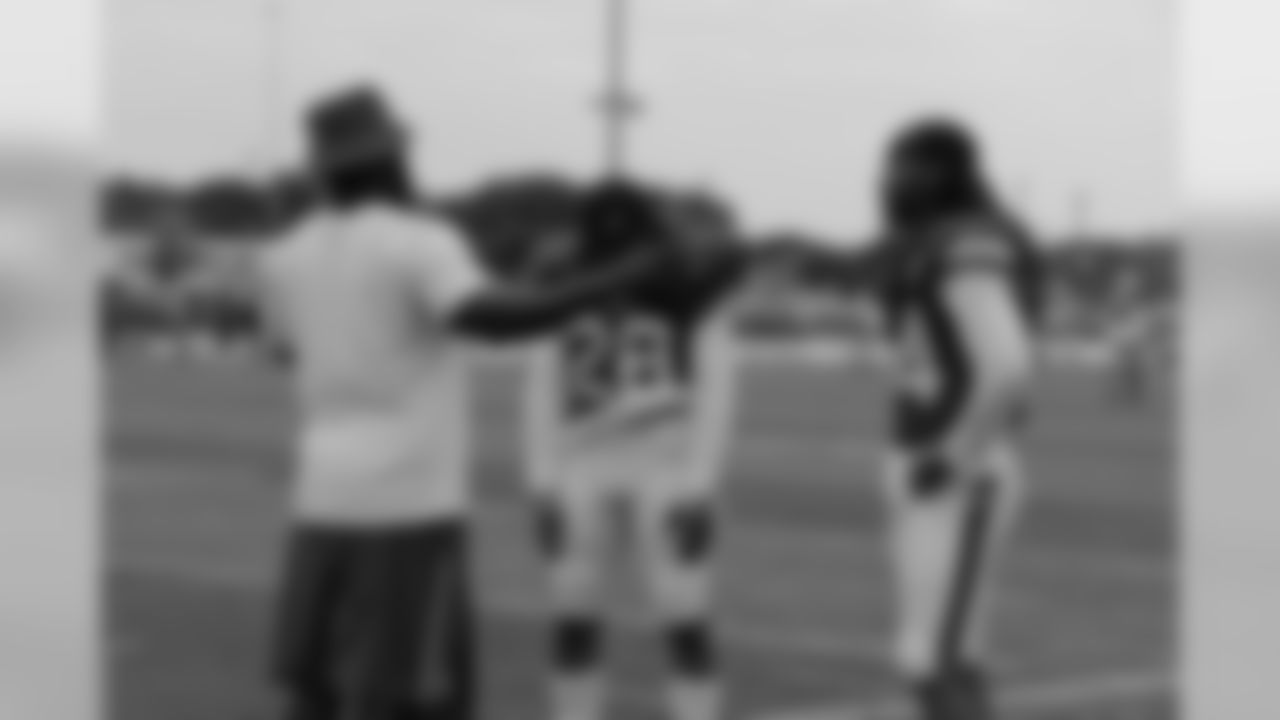 Cornerback Ronald Darby (28) and CB Stephon Gilmore (24) listen to Assistant Defensive Backs coach Ed Reed.