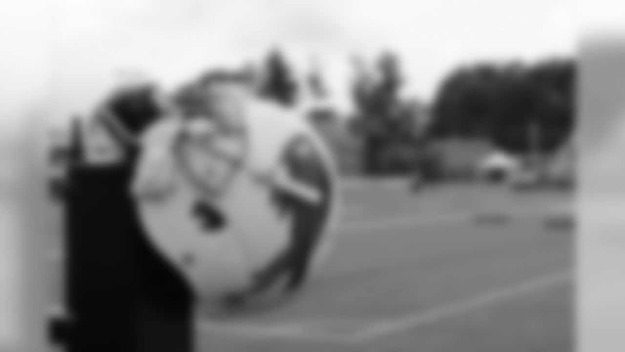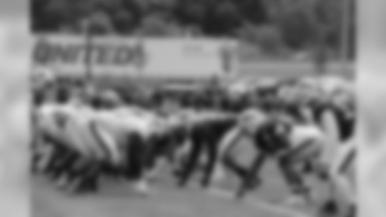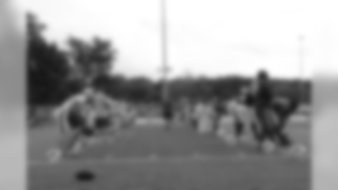 The offensive tackles run drills.