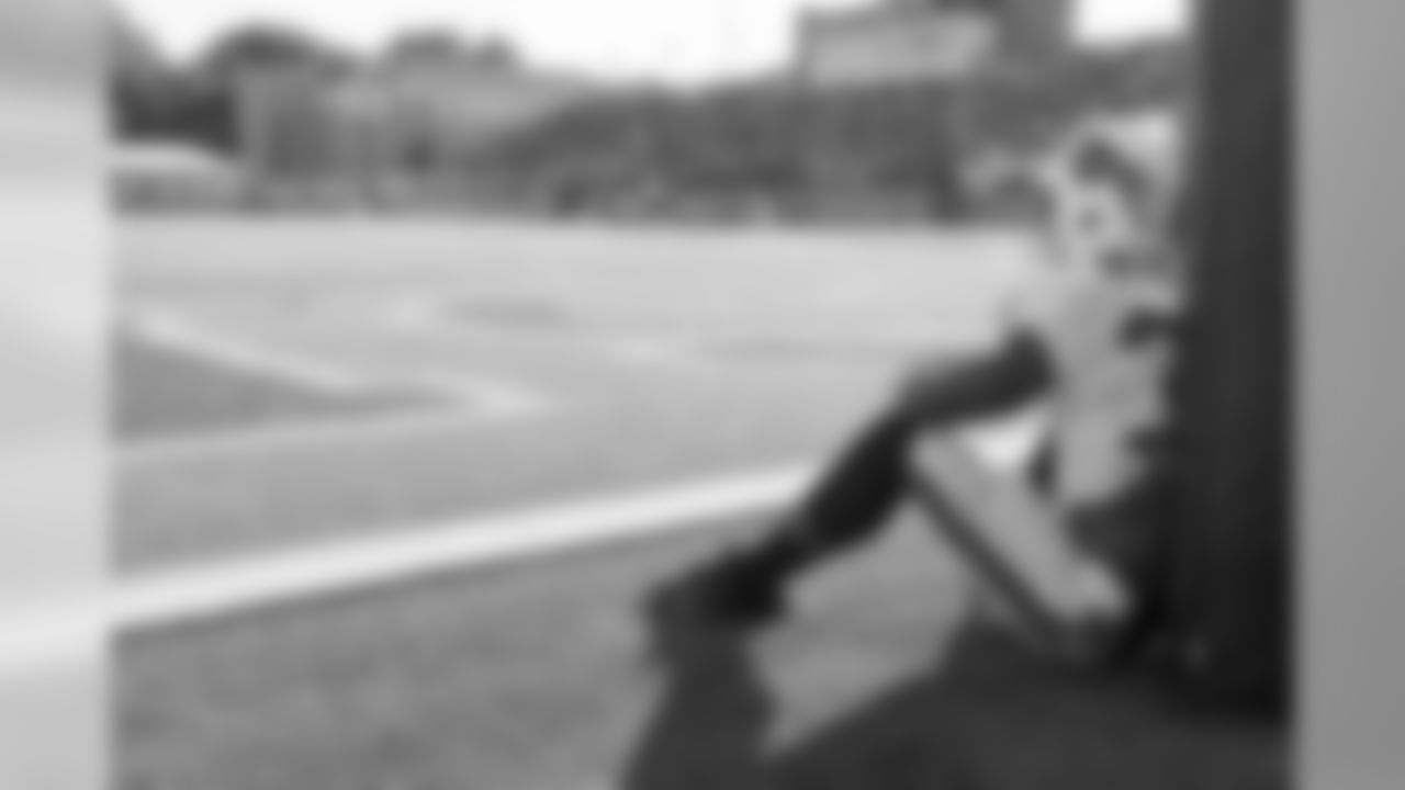 Running back James Wilder Jr. (38) leans against the goal post and looks onto the field before practice.