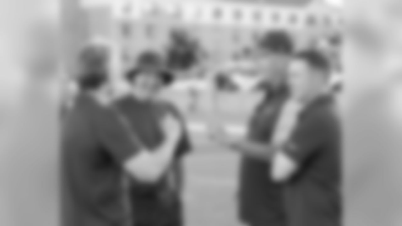 Owner Terry Pegula, head coach Rex Ryan and others gather and laugh on the sidelines.