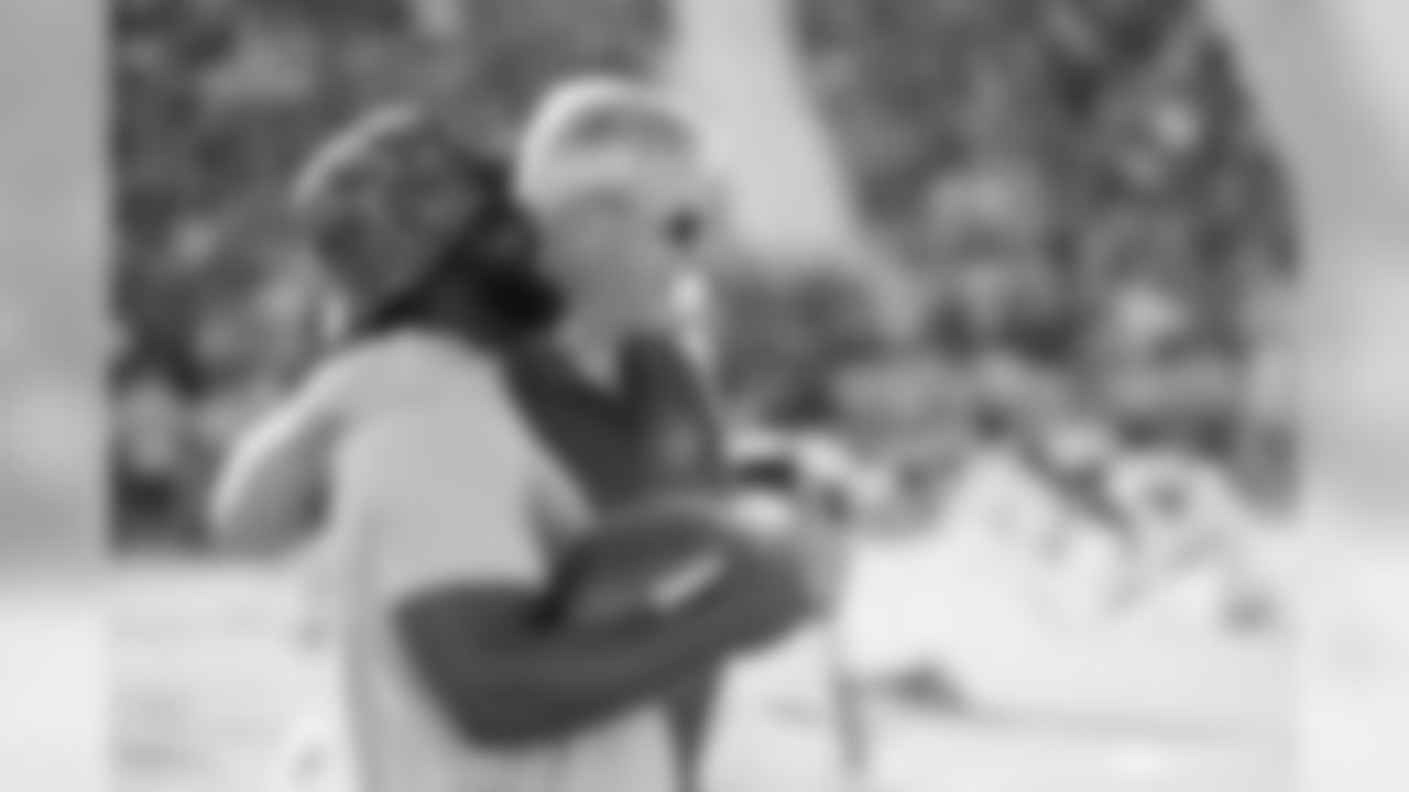 Cornerback Ronald Darby (28) and quarterback Tyrod Taylor (5) stretch before the scrimmage.