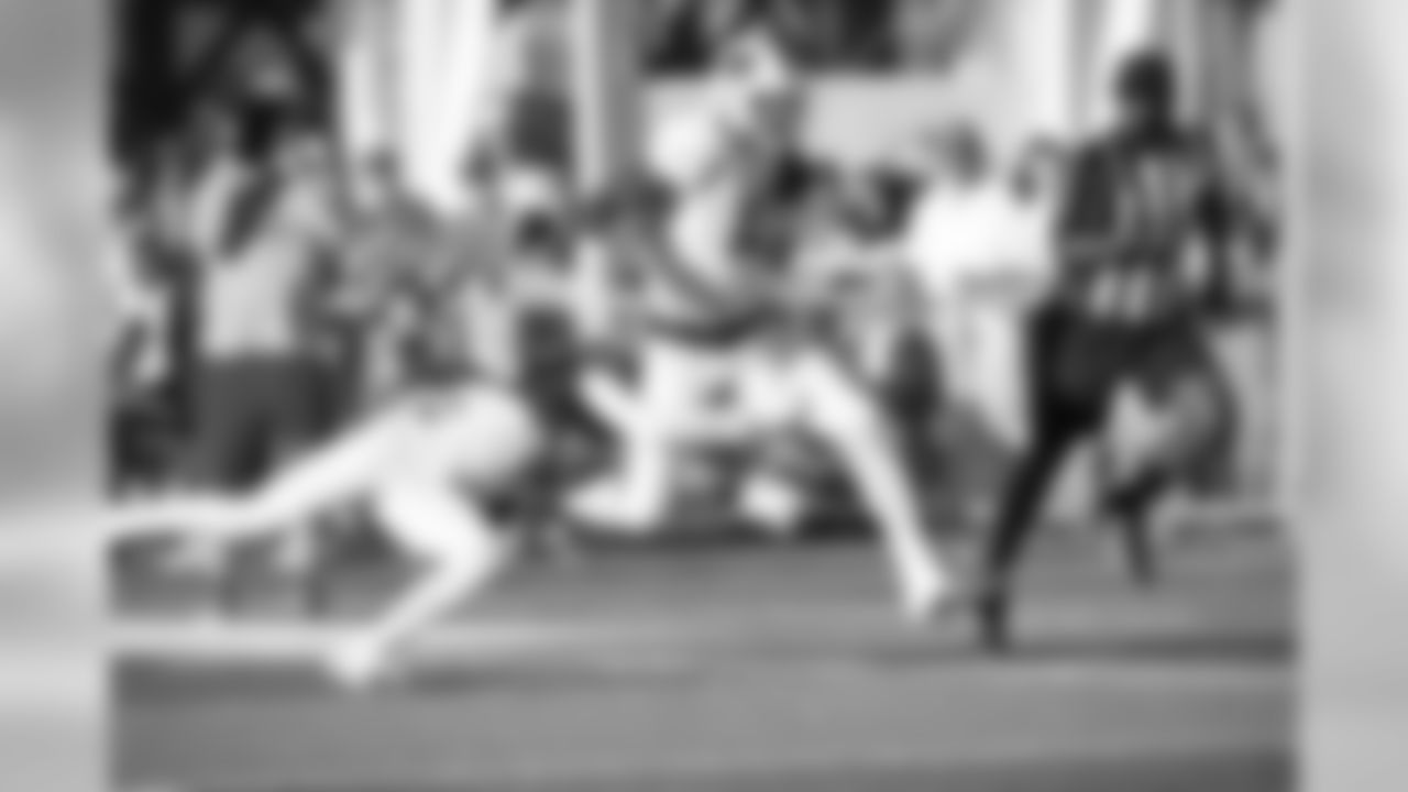 Wide receiver Marquise Goodwin (88) reaches for a ball while being covered by safety Jonathan Meeks (36).
