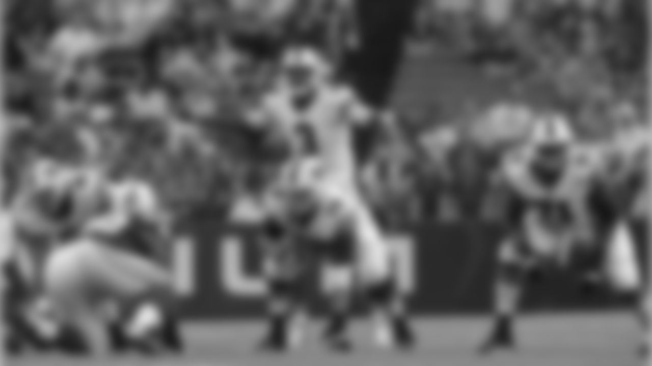 Defensive tackle Marcell Dareus (99) blocks for quarterback Tyrod Taylor (5).