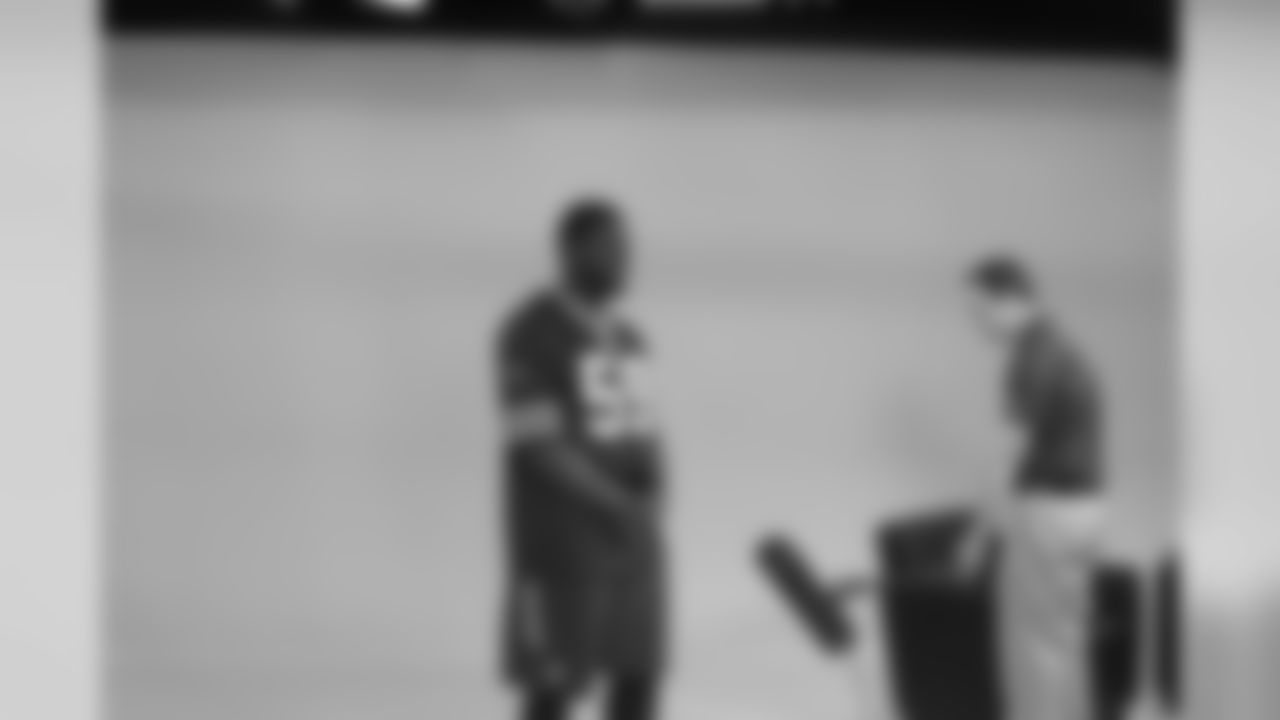 Running back LeSean McCoy and quarterback Tyrod Taylor smile for the camera at Media Day 2016.