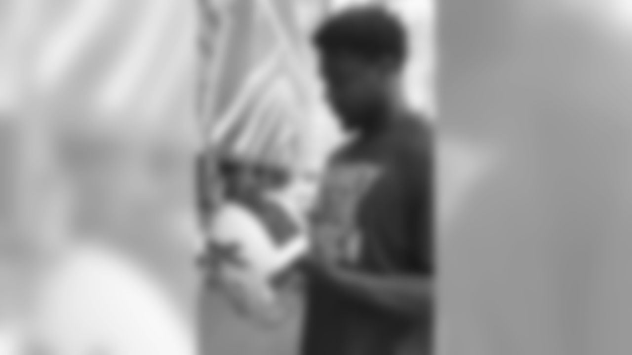 Tight end Charles Clay signs a helmet at Media Day 2016.
