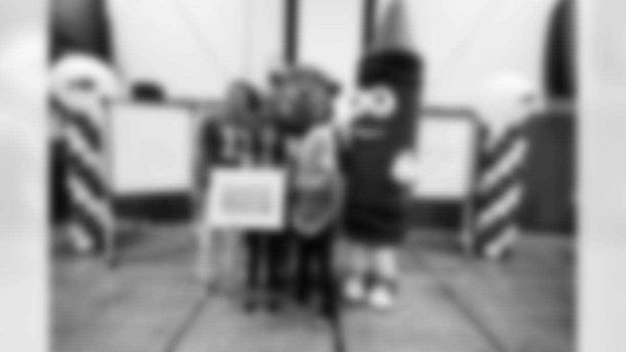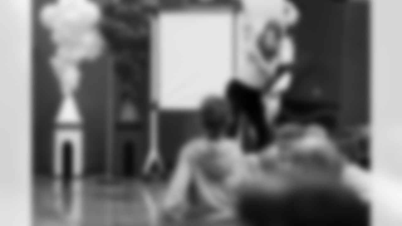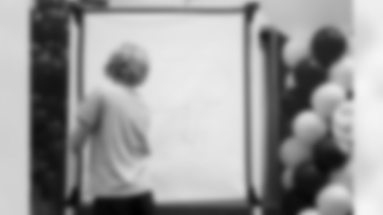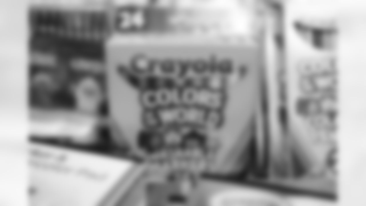 Mack Hollins and Billy Buffalo visited Ellicott Elementary school to return artwork to a former student Kailey Artiles. Crayola will make a product donation to the school and to The Teacher's Desk as part of the art return.