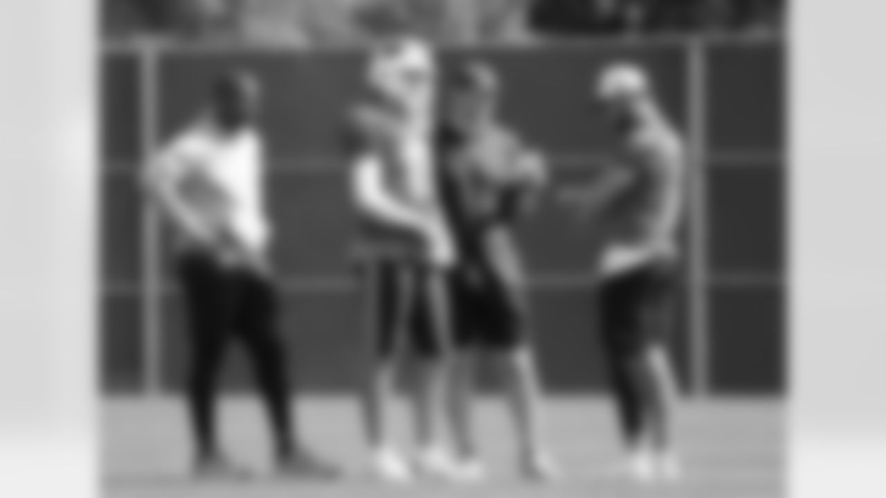 Ronald Curry, Josh Allen (17), Joe Brady, Mitchell Trubisky (11). Buffalo Bills practice, August 28, 2024 at One Bills Drive.