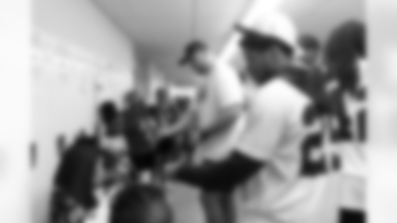 Buffalo Bills players take a look at some student creative contest entries during Buffalo Bills Team Community Takeover, June 04, 2025 at Parkdale Elementary School in East Aurora, NY.