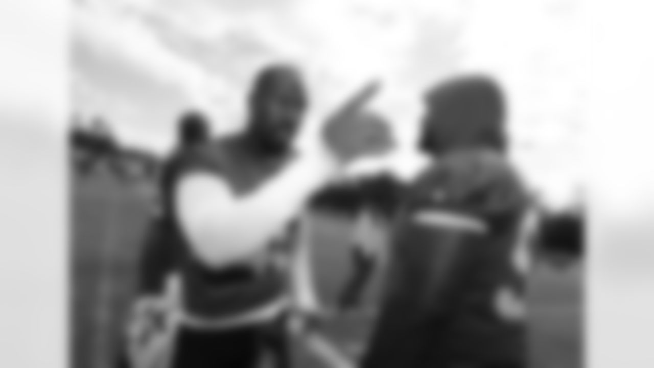 Bobby Babich with Joe Giles-Harris (42). Day 5 of Buffalo Bills Training Camp at St. John Fisher, July 29, 2022. Photo by Bill Wippert